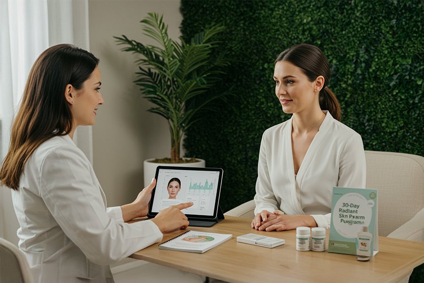 Health and lifestyle assessment, skin analysis, custom skincare, product and supplement advice, and a 30-day Radiant Skin Program.